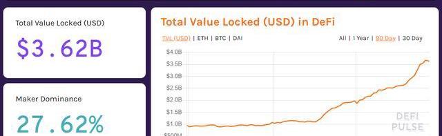 defi协议锁定资产的总值,已经从5亿美元增加到36亿美元。最快的记录是只用两天时间就增加4亿美元的锁定。而Defi的启动阶段,从0美元到4亿美元花了18个月。