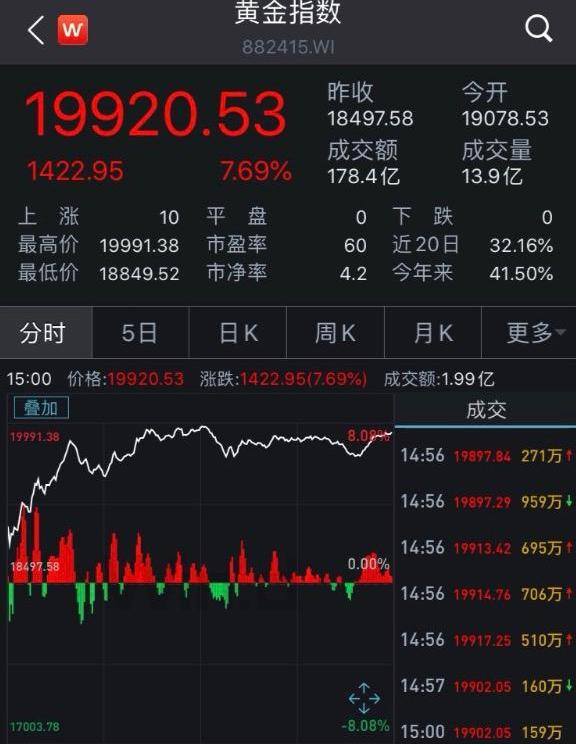 受黄金上涨的消息刺激,27日,Wind黄金指数大涨7.69%,个股方面,潮宏基、华钰矿业、豫光金铅、周大生、盛达资源、赤峰黄金、西部黄金涨停,中润资源、老凤祥、中金黄金、山东黄金、恒邦股份、紫金矿业、湖南黄金等涨逾6%。