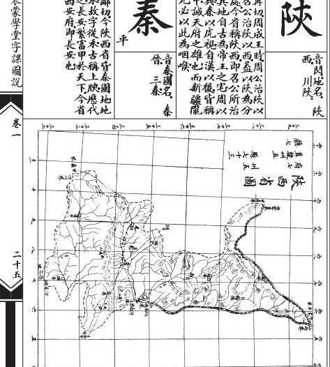 “皖”字的解释是:“地名,古皖国在今安徽境,故通称安徽省曰皖。省会在安庆府,地处吴楚之交,而长淮南北。为中原形胜所系,尤有事所必争,境内险隘多山,而大江以南,物产饶衍,有长江通商口岸一。”字下面都附有各省的手绘全图,可以让学生知其大略。