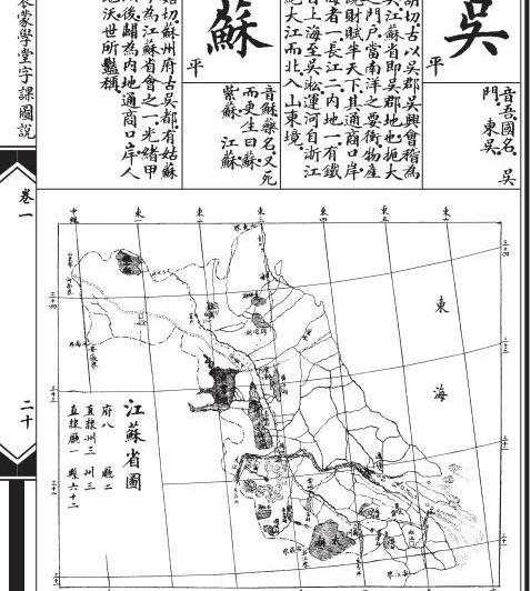 这即是现在江苏省的前身,江苏简称“吴”。江苏那时有两个省会城市,一个是南京,叫江宁;一个是苏州,简称苏。明清的时候,江苏省便被分江而治,南京管理江北,苏州管理江南。《字课图说》介绍“苏”字有:“药名,又死而更生曰苏。”解释中说:“苏州府古吴都,有姑苏山,今为江苏省会之一。光绪甲午以后,辟为内地通商口岸,人稠地沃,世所艳称。”中日甲午战争是1894年爆发的,随后于1895年签订了马关条约。在战争中北洋水师全军覆没,马关条约迫使苏州等四个口岸通商,这通常被认为是列强瓜分中国的开始。这些内容出现在课本中,一定会增加当时小学生的愤慨情绪。