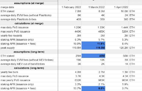 另外,结合EIP1559的手续费销毁以及PoS合并后的相关经济参数,JustinDrake预测,理想状态下,未来ETH的供应上限可能为1.2亿,并且在EIP1559的销毁作用下,ETH有望实现通缩,在11年内总供应缩减到1亿。并且在PoS发行以及手续费收入的综合下,参与ETH2.0质押的年化收益率区间有望为8.4~19.8%。