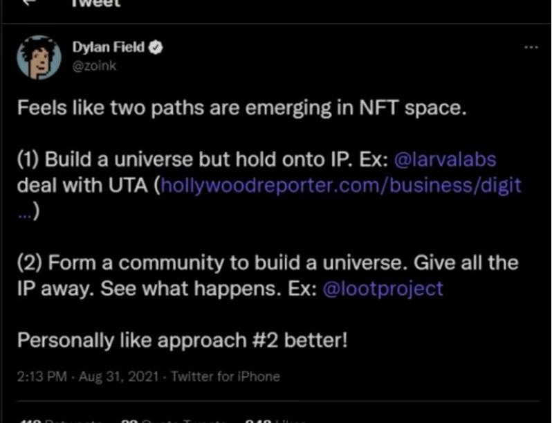 所以这里有一种不一样的方法,你在BoredApeYachtClub是自上而下的,其中创造者本质上必须在NFT和Loot中提供价值和创新,这实际上是一种自下而上的方法,允许收藏家和在社区中实际拥有碎片以建立NFT价值的人。