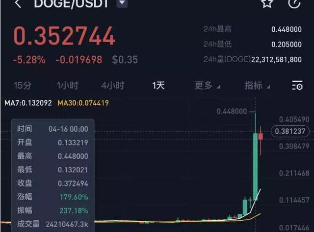 4月15日,狗狗币大涨50%;4月16日再度暴涨,24小时内涨幅一度达250%,最高触及0.47美元/枚,总市值一度突破600亿美元。