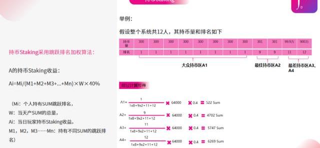 持币Staking顾名思义,持有SUM即可获得相应的受益,但如此简单的模型将会导致资产逐渐流向巨鲸玩家,普通参与者的受益情况不容乐观,导致生态的发展走向畸形的中心化。因此SUM的持币Staking没有按照用户持币量加权平均计算收益,而是采用跳跃排名加权算法。