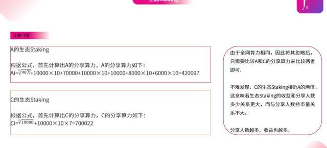 除了AMM流动性挖矿和持币Staking,SUM的生态Staking同样丰厚,不仅占据每日产出量的40%,且与分享人持币数量关系不大,分享人数越多,收益也越多,不仅拓宽了新成员加入SUM生态的渠道,也为项目的发展壮大奠定了良好的社区基础。生态Staking同样设计了精妙的数学算法,这种算法使得邀请的生态越强大,获取的生态Staking越多,且生态Staking同样有打散巨鲸大户的作用,非常有利于社区的壮大。