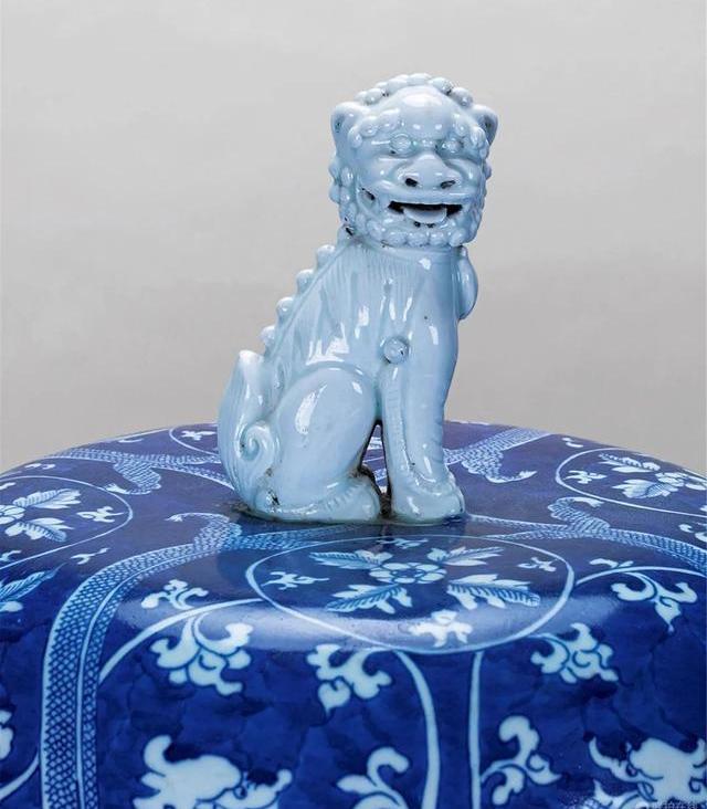 Lot2091清康熙青花留白龙穿花狮钮大罐一对
