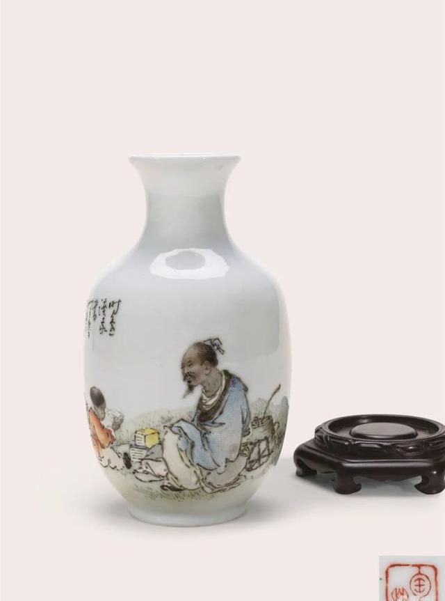 赏析:此件撇口,鼓腹,圈足。瓶器形精巧,曲线优美,胎体坚质,釉水洁白滋润。王琦又以神来之笔,绘一翁闲坐神情专注而安和,一竹篓置于身侧,另一侧一黄衣小童背身读书,人物注重脸部描绘,神情捕捉准确,衣纹勾线以中锋用笔,虬结生姿,刚中有柔,整而不乱。整幅工写相兼,概括简洁洗练,见挥洒自如之意,表现出文人恬淡的生活情调和儒雅的书卷气息。瓶落款“时还读我书时在庚午仲夏月仿黄慎法西昌淘迷道人王琦。”其中“时还读我书。”出自晋陶渊明《读山海经》文。作品作于1930年,“月圆会”成立第三年,正值王琦创作的高峰期,此时期王琦的瓷画不仅画艺极佳,且诗书、画、印相辅相映,最具特色,此作落印章“西昌王琦、匋斋、匋匋斋”。