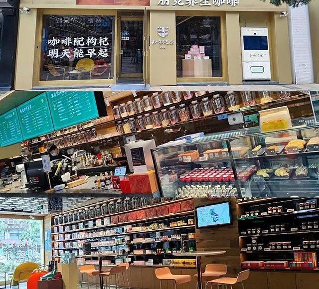 相较于骏豪店不太起眼的位置和外面几乎看不见的招牌,被称为“知嘛健康壹号店”的双井门店就显眼了很多。在位于北京朝阳区富力城附近门店的上方,打着“朋克养生咖啡”的招牌,而落地窗上,还赫然写着“咖啡配枸杞,明天能早起”的Solgen。走进门店,装潢非常个性,引来了不少网友纷纷打卡。