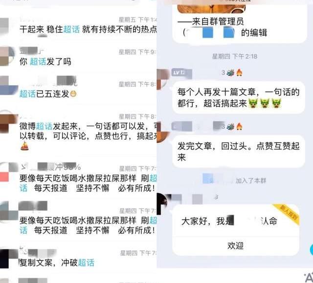 群里的人卖力宣传,甚至用上了“饭圈”打榜的方式。有的群里每天都有人动援群友打榜,称“微博超话,五连发,长文配图就更好了”,“超话掉了,老板们,超话发起来”,“超话干上第一名,恳请大家不要躺平”。