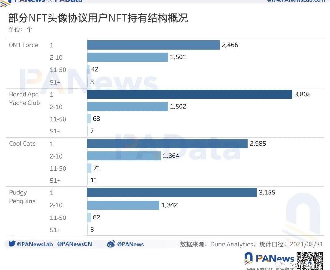 尽管如此,但值得注意的是,当前BoredApeYacheClub、PudgyPenguins、0N1Force和CoolCats中都有1000余个地址持有了2-10个NFT,这部分地址数量占各自持有地址总量的比值约为27.92%、29.42%、37.41%和30.78%,平均占比约为31.38%,这或意味着NFT头像的深度用户正在形成。