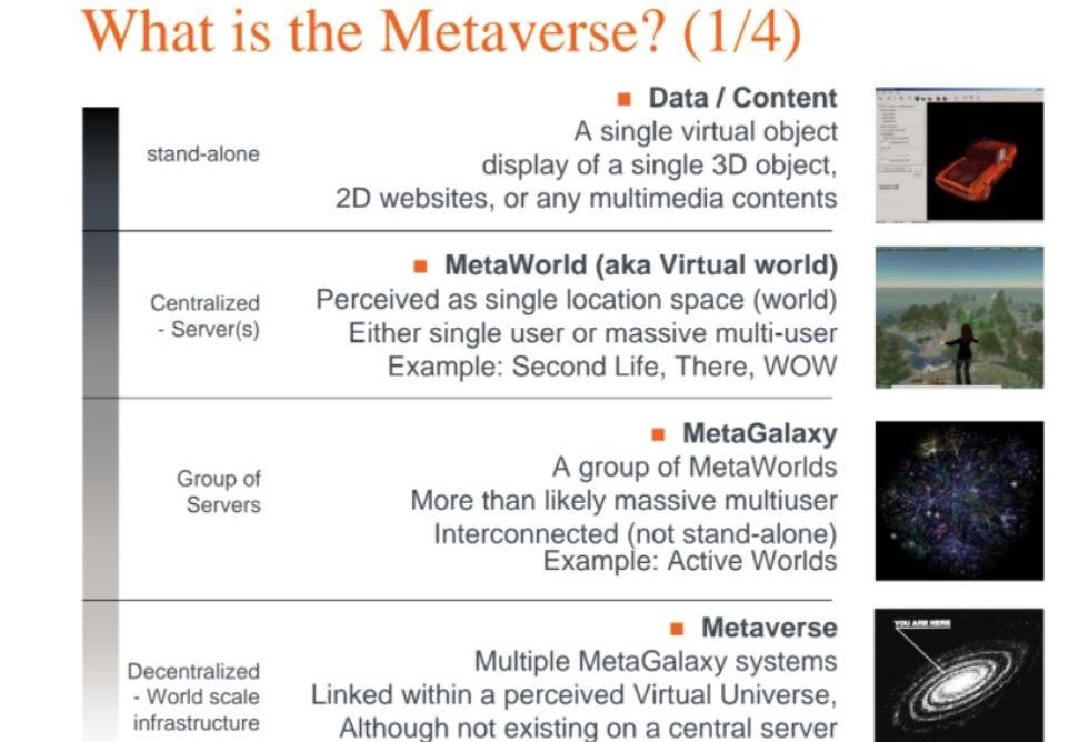 我最终跌跌撞撞地回到原来的帖子,然后发现了一篇题为《Solipsis:虚拟环境的去中心化架构》的演讲稿,它是由一组研究人员在2008年编写的,这篇演讲稿提供了最有见地的元宇宙框架,即元宇宙根本上是由内容、元世界以及元星系组成。