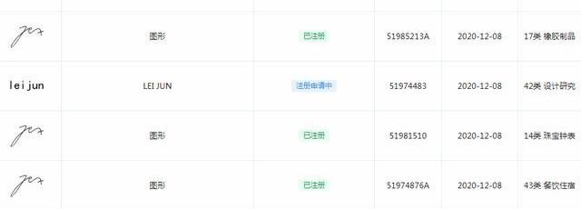 从这些商标申请信息来看,小米公司对雷军的名字拼音商标和手写签名商标都是45类全类注册,可以说是进行了全方位的保护。