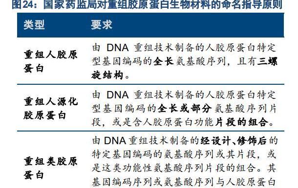 胶原蛋白:是一类高分子蛋白质家族,包括多种类型,每种类型的蛋白质分子都有其特定的基因编码,对应不同的氨基酸组成和排列方式,并由此就决定了胶原蛋白不同的空间结构和功能。从制备方法看,胶原蛋白过去只能从动物组织中提取,随着基因工程技术进步目前也可以通过人的基因片段重组表达实现规模化、低成本生产,且我国的胶原蛋白重组技术已处于全球领先水平并持续快速发展。由于胶原蛋白种类多、分子结构复杂,人工重组生产的技术难度较大,尤其作为医美填充材料的胶原蛋白,需要更低的致敏性及更高的生物活性和支撑性,因此需要做到与人胶原蛋白链氨基酸序列一致,并且要由三条α-肽链构成特定的三螺旋空间结构,这对相关公司的重组技术提出了更高要求。锦波生物旗下重组人源化胶原蛋白填充剂“薇旖美”,其氨基酸序列的重复单元与人胶原蛋白氨基酸序列特定功能区相同,且功能区域具有164.88°柔性三螺旋结构,2021年成功获批为III类医疗器械,标志着重组胶原蛋白在医美领域的应用技术取得突破性进展;巨子生物已构建起重组胶原蛋白分子库,包含3种全长重组胶原蛋白,即Ι型、Ⅱ型及III型重组类人胶原蛋白,25种功能强化型重组胶原蛋白和5种重组胶原蛋白功效片段,其中全长重组胶原蛋白可以做到与人胶原蛋白链氨基酸序列完全一致。我们认为,随着基因工程技术快速发展,叠加胶原蛋白巨大的潜在应用市场驱动,相关企业有充足的动力积极推进重组胶原的技术升级和相关产品的商业化开发,未来重组胶原蛋白的功效,尤其是生物活性和支撑性方面,有望逐渐提升甚至达到与天然胶原蛋白趋同的水平。