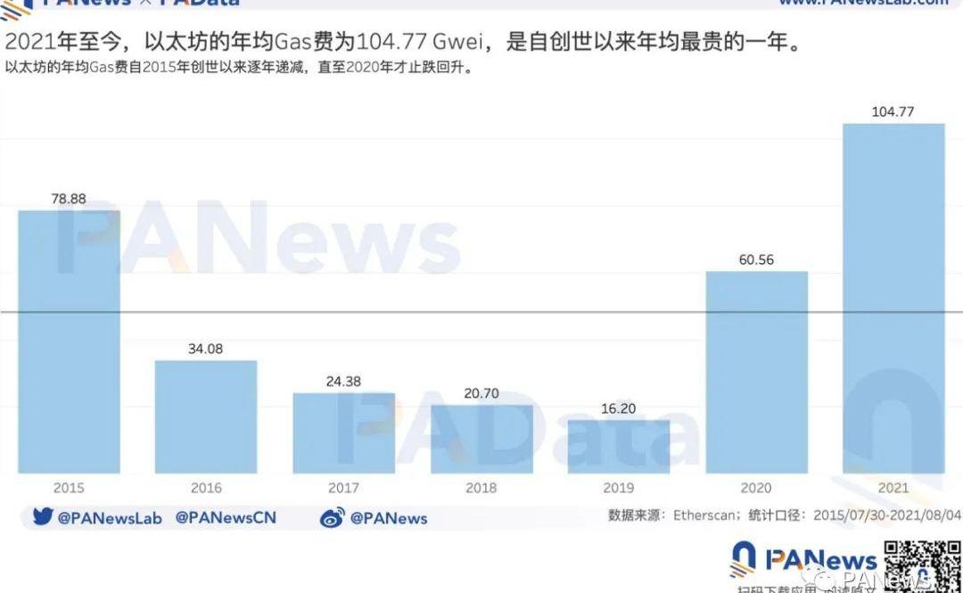 5、2021年至今平均Gas价格为104.77Gwei,是自创世以来均价最贵的一年,6年增长了约33%。