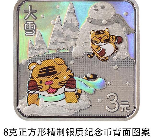 8克正方形银质纪念币背面图案以虎、雪人、松树为主要设计元素,展现大雪时节“至此而雪盛也”景象、打雪仗嬉戏场景,并刊“大雪”字样及面额。