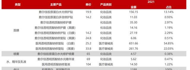公司械字号产品占据过半收入。2019-2021年公司械字号产品收入规模分别为9.2/8.8/9.3亿元,占比分布为68%/56%/56%。1)械字号产品:医用透明质酸钠修复贴、医用透明质酸钠修复贴、医用透明质酸钠修复液,2021年三种产品销售收入占械字号收入比重分别为70.23%、28.21%、1.56%。2)妆字号产品:玻尿酸和胶原蛋白产品共有8款,其中胶原蛋白产品有3款,包括敷尔佳胶原蛋白水光修护贴、敷尔佳胶原蛋白多效修护贴、敷尔佳胶原蛋白水光修护喷雾,2021年三者销售收入占化妆品收入比重分别为21.64%、1.53%、0.63%;玻尿酸产品主要有5个:敷尔佳透明质酸钠修护膜、敷尔佳透明质酸钠修护膜、敷尔佳透明质酸钠修护贴、敷尔佳透明质酸修护贴、敷尔佳透明质酸钠水光精华液,2021年5种产品销售收入占化妆品收入比重分别为4.89%、1.96%、3.77%、0.84%、0.78%.