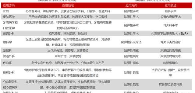 1)传统医疗,基于其生物相容性和诱导细胞分裂增殖等特性,运用于创面敷料、止血材料、注射填充材料以及药物载体等领域。2)医美,主要用于注射填充剂及美塑领域。3)专业皮肤护理,主要运用于医美术后修复的医用敷料和功能性护肤。4)食品领域,多用于功能性食品和食品添加剂。