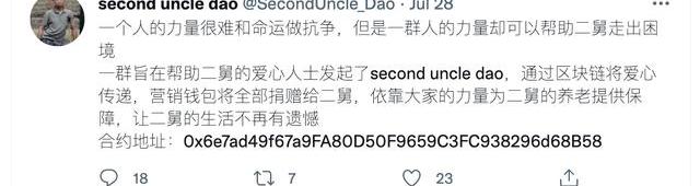 项目方以“旨在通过区块链传递爱心,为二舅养老,让二舅的生命不再有遗憾”为项目宗旨,于7月28日建立了一个自称是“seconduncledao”的去中心化自治组织,并发行一个名为“secondunclecoin”的代币,并宣称营销钱包收入将全部捐赠给“二舅”。