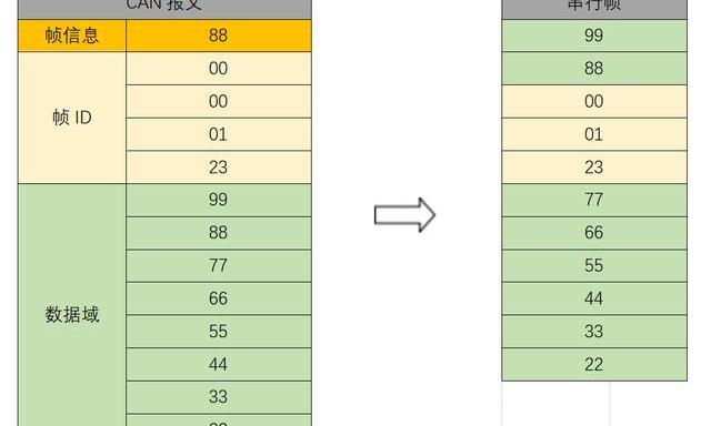 串行帧中所带有的CAN报文的“帧ID”在串行帧中的起始地址和长度可由配置设定。起始地址的范围是0~7,长度范围分别是1~2或1~4。转换时根据事先的配置将串行帧中的CAN报文“帧ID”对应全部转换到CAN报文的帧ID域中,其它的数据依序转换,如果一帧CAN报文未将串行帧数据转换完,则仍然用相同的ID作为CAN报文的帧ID继续转换直到将串行帧转换完成。