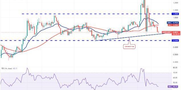 对多头的一个小利好是RSI正在形成看涨背离。这表明看跌势头可能正在减弱。ADA/USDT货币对可能会尝试从支撑线反弹,该支撑线可能会在20日均线处触底。