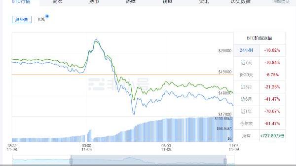北京商报讯币圈再遇暴跌大风暴。11月9日,北京商报记者注意到,虚拟货币市场全线闪崩,其中,比特币再次失守2万美元关口,从0点45分的20570美元一路下挫,并在短短3个小时内接连跌破2万美元、1.9万美元、1.8万美元,最低下探至1.77万美元左右。截至11月9日11时30分,比特币最新价格报18195美元,日内跌幅仍达10.82%。