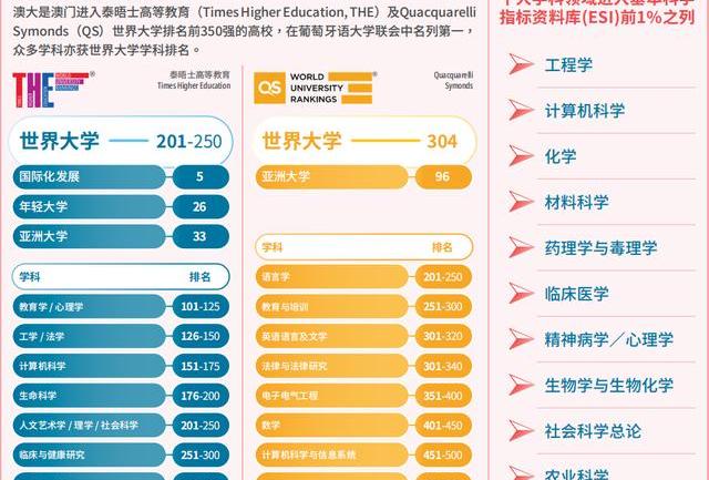 澳门大学涵盖的十大学科领域:工程,计算机科学,化学,材料科学,药理学和理学,临床医学,精神病学/心理学,生物学和生物化学,社会科学、农业科学进入基本科学指标数据库前1%之列。