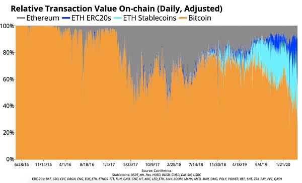 为了更全面地了解比特币与以太坊的占比,我们可以引入以太坊区块链上运行的ERC-20代币和稳定币更大的生态系统。引入以太坊,ERC-20代币和以太坊稳定币之后,比特币目前仅处理链上相对价值的约40%。最近几天稳定币正在发展迅速,占据了以太坊上大部分的新交易量。