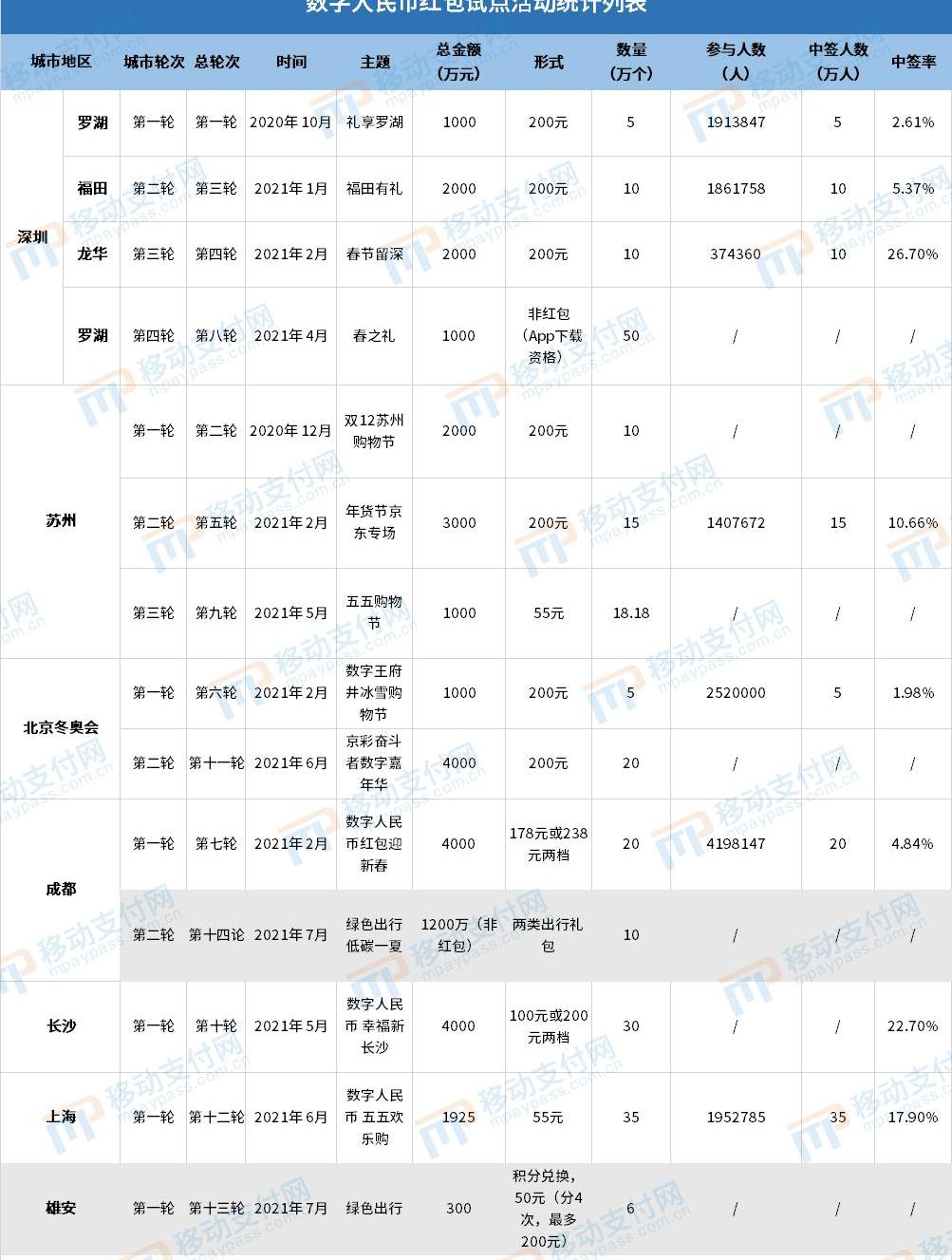 另一方面,活动规模和活动奖励不同。雄安此次活动是该地区第一次公开对外举行的数字人民币测试活动,而由于雄安属于河北省管辖的国家级新区,常住人口不过百万级别,与其它试点城市相比存在一定差距,因此采用“兑换”的形式非常合理,方便全民参与的同时也更具新意;而成都是四川省会,常住人口超过两千万,作为该地区第二次试点活动,千万级别的活动金额是必不可少的。