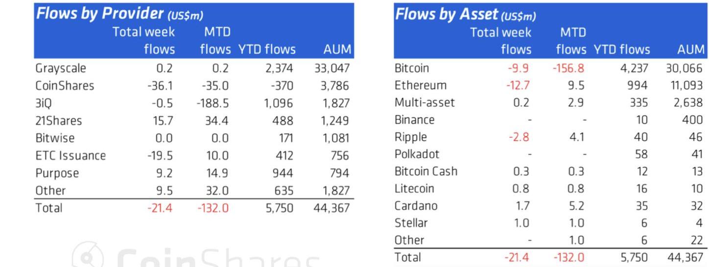 数字资产投资产品连续第二周呈现资金流出,流出总额为2100万美元,低于前一周的9400万美元。这使自5月中旬以来的每周总流出额达到2.67亿美元,占总资产管理规模(AUM)的0.6%。