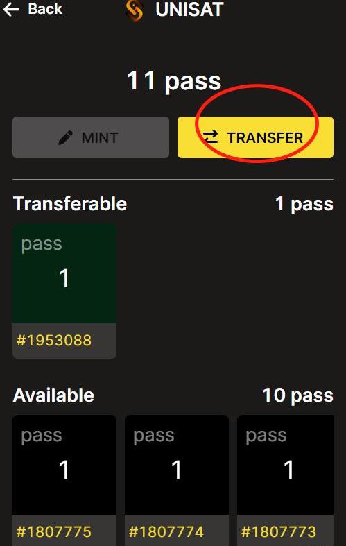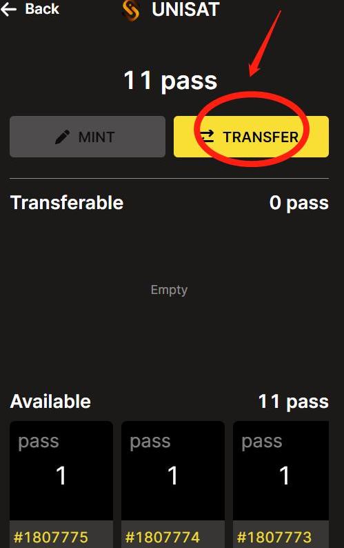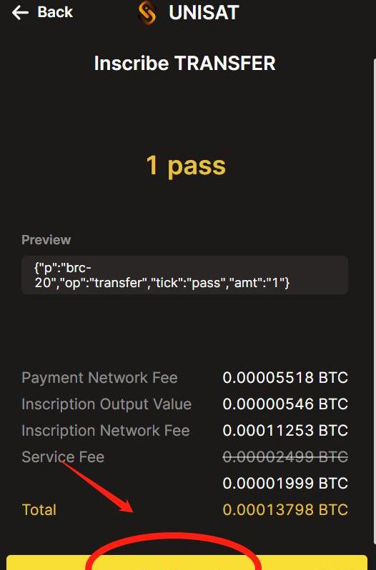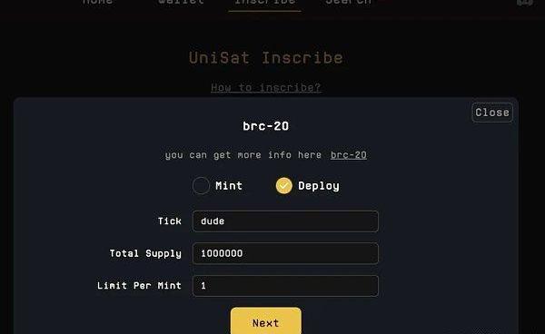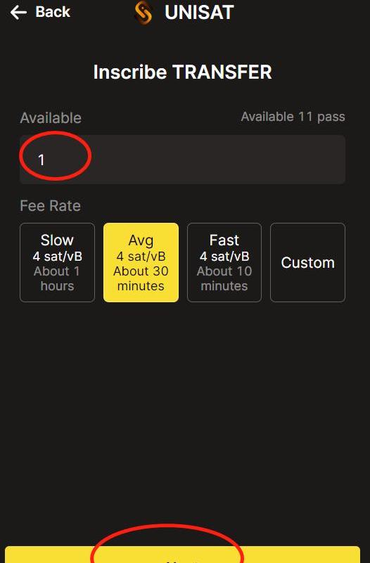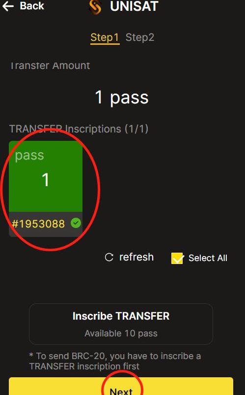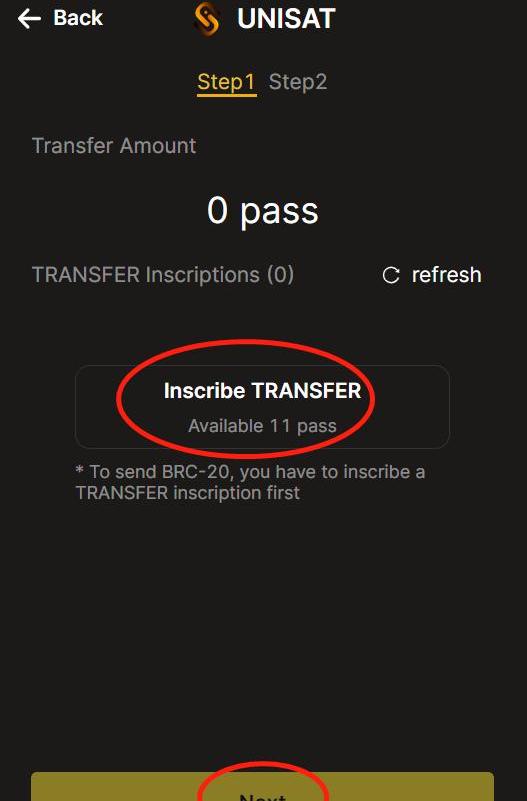 点击inscribetansfer铭刻,点击NEXT填写数量,这里根据对应的brc20代币部署要求,不能超过limit值,这里的pass最大时1,点击next。