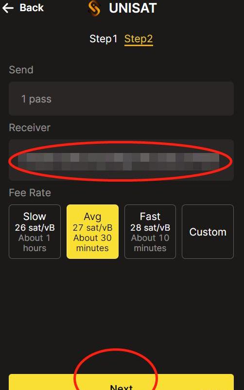 步骤3:输入你的比特币地址接收.sats,并选择网络费用