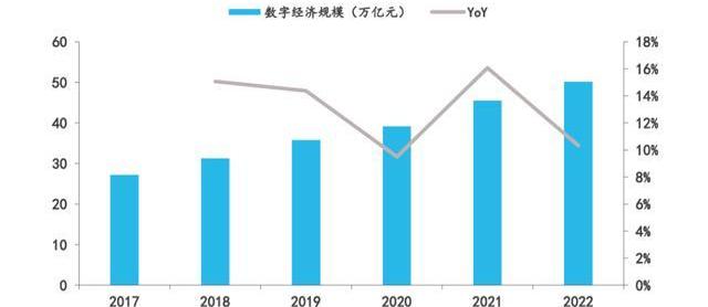 2022年我国数字经济规模已经超过50万亿元,占GDP比重超过40%,继续保持在10%的高位增长速度。