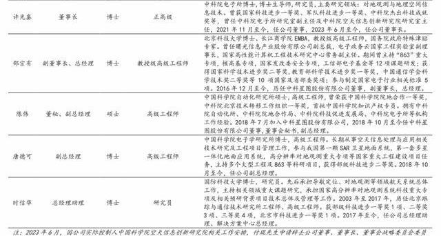 公司董事长许光銮曾任中科院电子所研究室副主任及中科院空天信息创新研究院研究室主任,曾获国家科技进步一等奖、军队科技进步一等奖等。副董事长、总经理邵宗有是教授级高级工程师,享受国务院政府特殊津贴,曾主持863专项、核高基专项等12项课题研发,曾获得国家科学技术进步二等奖、教育部科学技术进步一等奖等10项国家及省部委奖项。