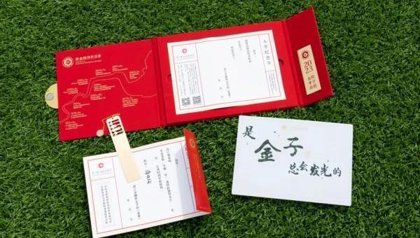 通知书封面印有“披沙拣金、融会贯通”的校训,封合处贴以金属校徽,传递“金融黄埔行长摇篮”的金融文化。内页左侧以钱塘江水系轮廓点题,展示自建校以来的历史发展沿革,铜制书签中“1975”算盘数字立意学校办学传承,“金”字雕刻纪念水晶卡则寓意学子从此开启金色人生。