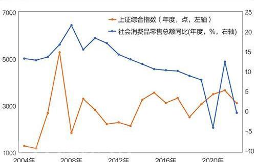 第六,从各国经济发展历史看,没有股权财富的增长,就不可能有效扩大中产阶级队伍,就不可能实现内需结构的重大调整,更谈不上消费拉动的可持续增长。实际上,国民财务健康与消费拉动相辅相成。如果在资产负债表恶化的状态下拉动消费,只能适得其反。非要强行拉动消费,国民的资产负债率会不断恶化,严重消耗经济增长潜力。我们现在是不是正在犯着这样的错误?从图2我们可以看出,A股市场的涨跌和社会消费品零售总额的增速之间,多少还是存在一定的正相关性关系的。