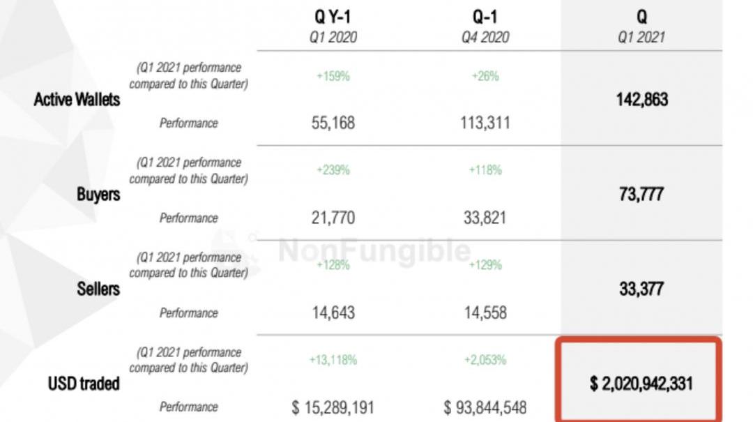 2020年至2021年,NFT大放异彩,根据NonFungible.com报告显示,2021年第一季度NFT销售额突破20亿美元,流通总价值已经超过2020全年。NFT确实是充满着魔力,发展的势头迅猛。