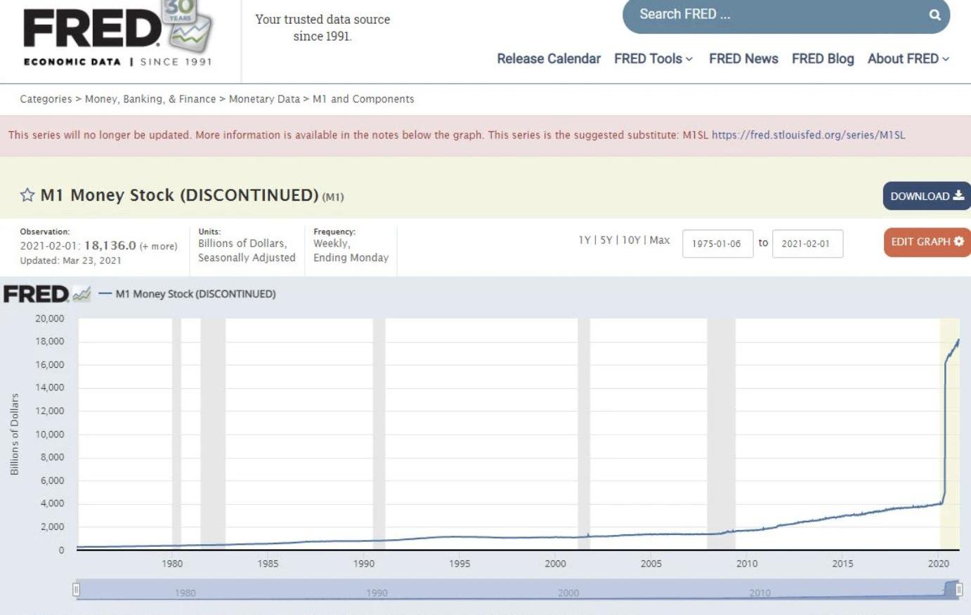 美国和魏玛共和国之间的第一个平行点是印钞。看看美国的M1和M2,它们是对流通中的美元数量的测量。M2也是一个用于预测通货膨胀的关键经济指标。