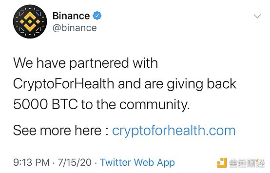 第二条信息于一小时以后属于Binance的账户发推称,该公司与”CryptoForHealth”社区合作,将5000BTC返还给社区成员。