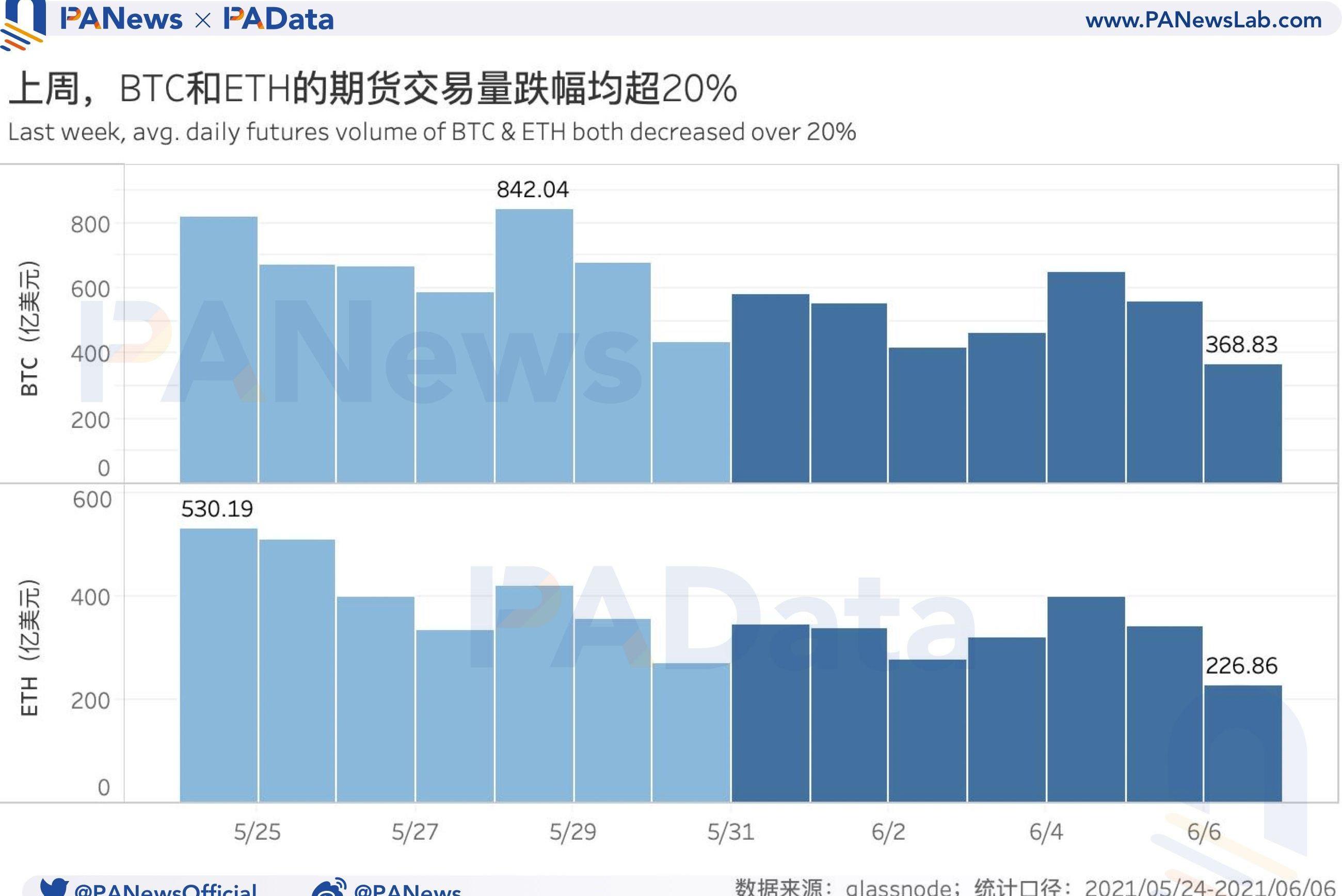 BTC和ETH的日均期货交易量持续走低,但跌幅较前一周收窄近一半。根据glassnode的数据,上周,BTC的日均期货交易量约为515.64亿美元,周环比下跌约23.57%;ETH的日均期货交易量约为322.02亿美元,周环比下跌约20.21%。6月6日,BTC和ETH的期货交易量仅约为368.83亿美元和226.86亿美元,创下近一个月来各自的最低值。