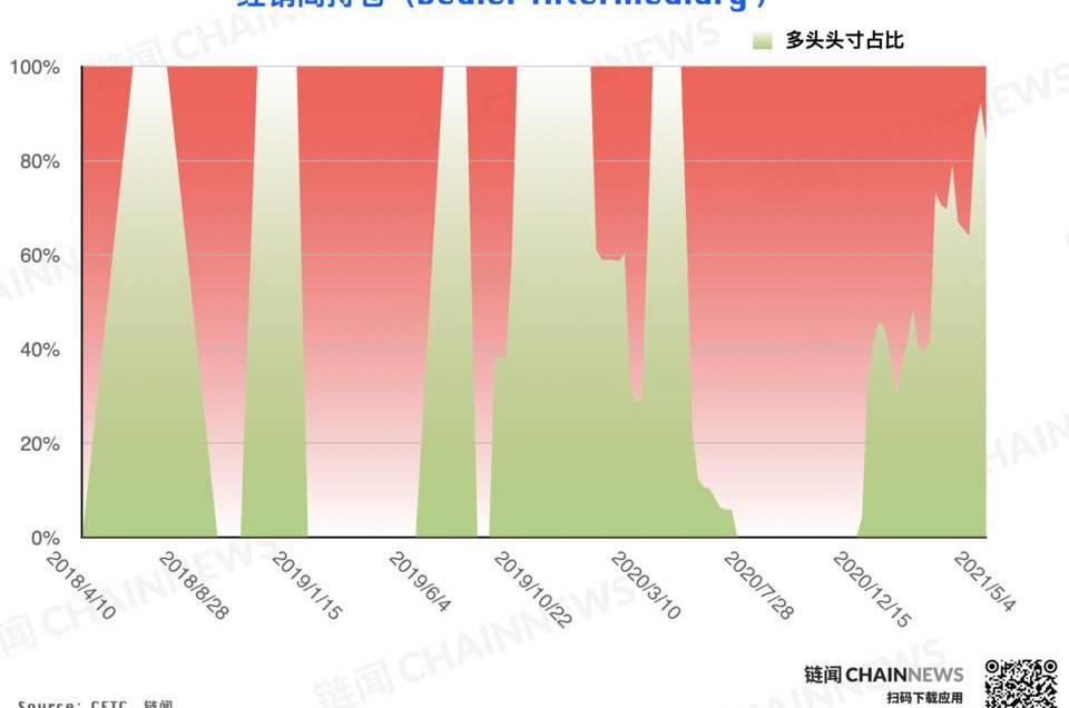 总持仓数量在最新一期数据中自8429张进一步下降至8306张,创出近9周新低,行情的震荡下跌导致总体持仓量一降再降,市场参与热度的持续下滑也显示出现有的回调表现尚未能引出「抄底」资金入场。
