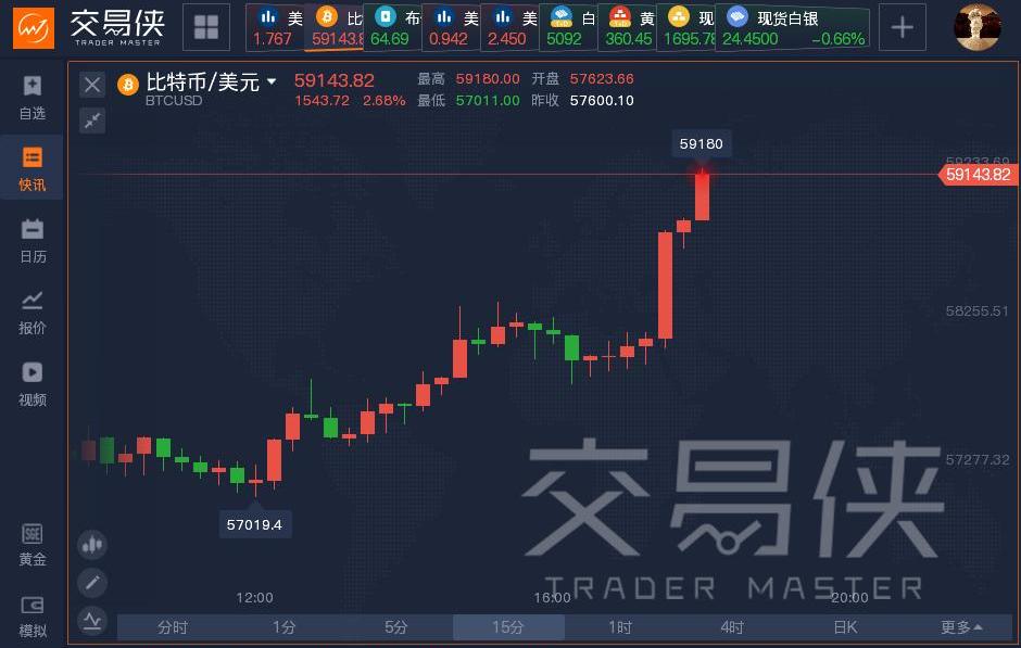 周二傍晚,比特币涨至59000美元/枚,为3月20日以来首次。