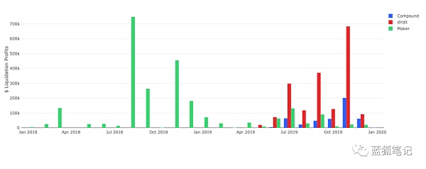 首先,很简单,从这些协议发布以来,试图清算这些协议贷款的地址数已经大幅增加,月活清算人从2018年1月的25个增长到2019年11月的142个。尽管存在一些数字重复,因为清算人会共享或轮换这些地址,但总体发展的趋势很明显。