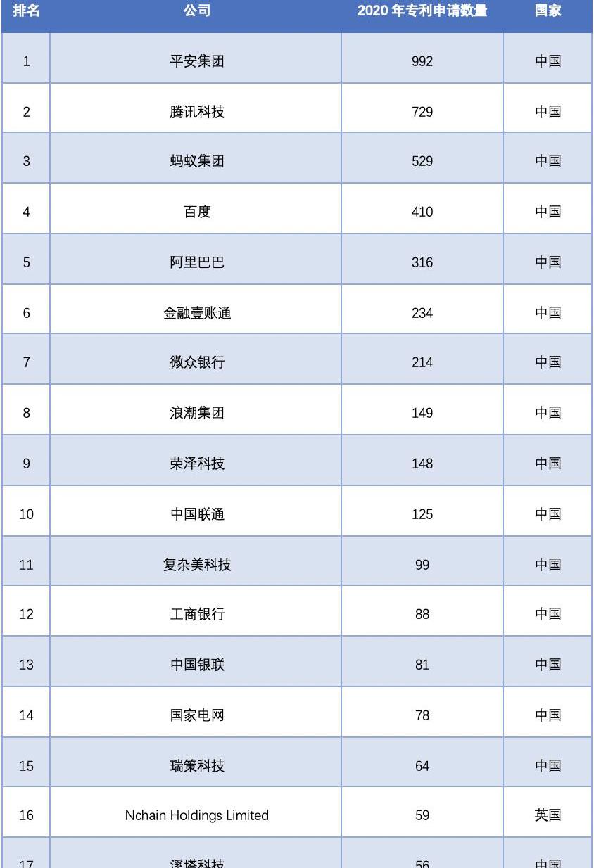 2、在2020年,我国新增区块链专利近8200件,有1257家公司参与了专利申请。专利申请数量最多的3家公司分别是平安集团、腾讯科技和蚂蚁集团。