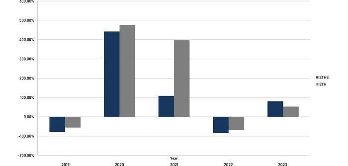 波动性:ETHE的波动性较高为137.75%,这意味着投资者可能面临较大的价格波动风险。相比之下,ETH的波动性较低为100.48%。