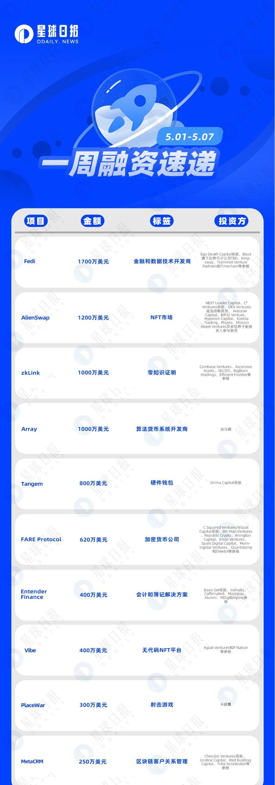从上周已披露的融资金额来看,比较受欢迎的项目有金融和数据技术开发商?Fedi,NFT?市场和聚合交易平台?AlienSwap以及基于零知识证明的多链统一交易基础设施?zkLink等。