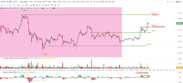 接下来可关注9420一线支撑(替换昨日9300),作为新的短线强弱分界线来看待,只要调整未明显跌破该价位都当做良性调整对待。上方阻力关注9700附近位置,短期出现有效上破的概率依旧偏小,有意做空的朋友可多留意币价在靠近此价位附近时时候有明显滞涨。