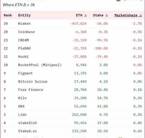 这正是正在发生的事情——在过去的一个月中,Kraken、Coinbase和火币失去了市场份额。实际上,所有ETH质押提款的36%都来自Kraken。