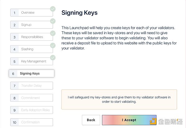 整个介绍部分还分为了这10个部分,每个部分都介绍了关于以太坊2.0的重点,这就好想是参与前要熟悉规则一样,这个还算比较贴心,不过这也代表着风险提示。只要点击每一步的“我接受”按钮即可,不过每个部分的内容要看一下。