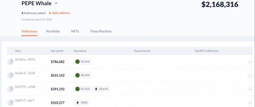 其次,来自ChangeNOW交易所的两个钱包。总共购买了5兆的PEPE代币,成本为0.1ETH,目前价值约为150万美元。