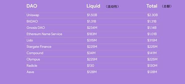 根据OpenOrgs.info的数据,截至2022年9月20日,GnosisDAO的总资金为11.4亿美元,但只有2.34亿美元的流动性。下表更详细地展示了10个DAO的资金构成。